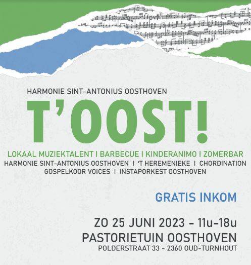 Op zondag 25 juni 2023 waren we met Gospelkoor Voices te gast op het zomerevenement T'OOST! georganiseerd door Harmonie Sint-Antonius Oosthoven. Tussen 13.00u - 13.45u vond je Voices daar op het podium.